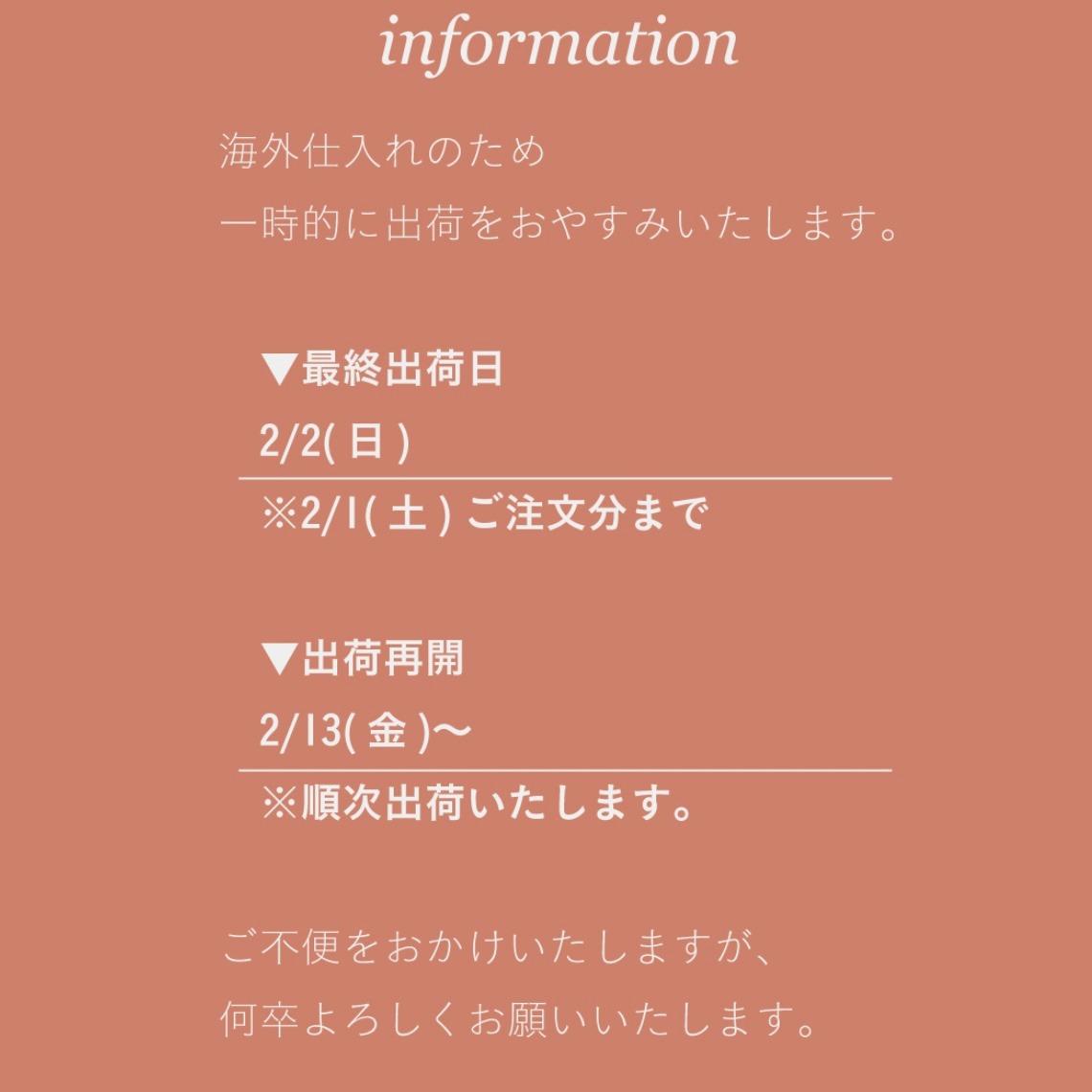 海外仕入れのため、出荷は2/13から再開いたします🛩️