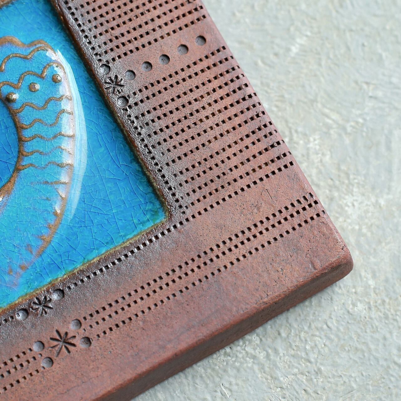 目を惹く陶板の壁掛け。