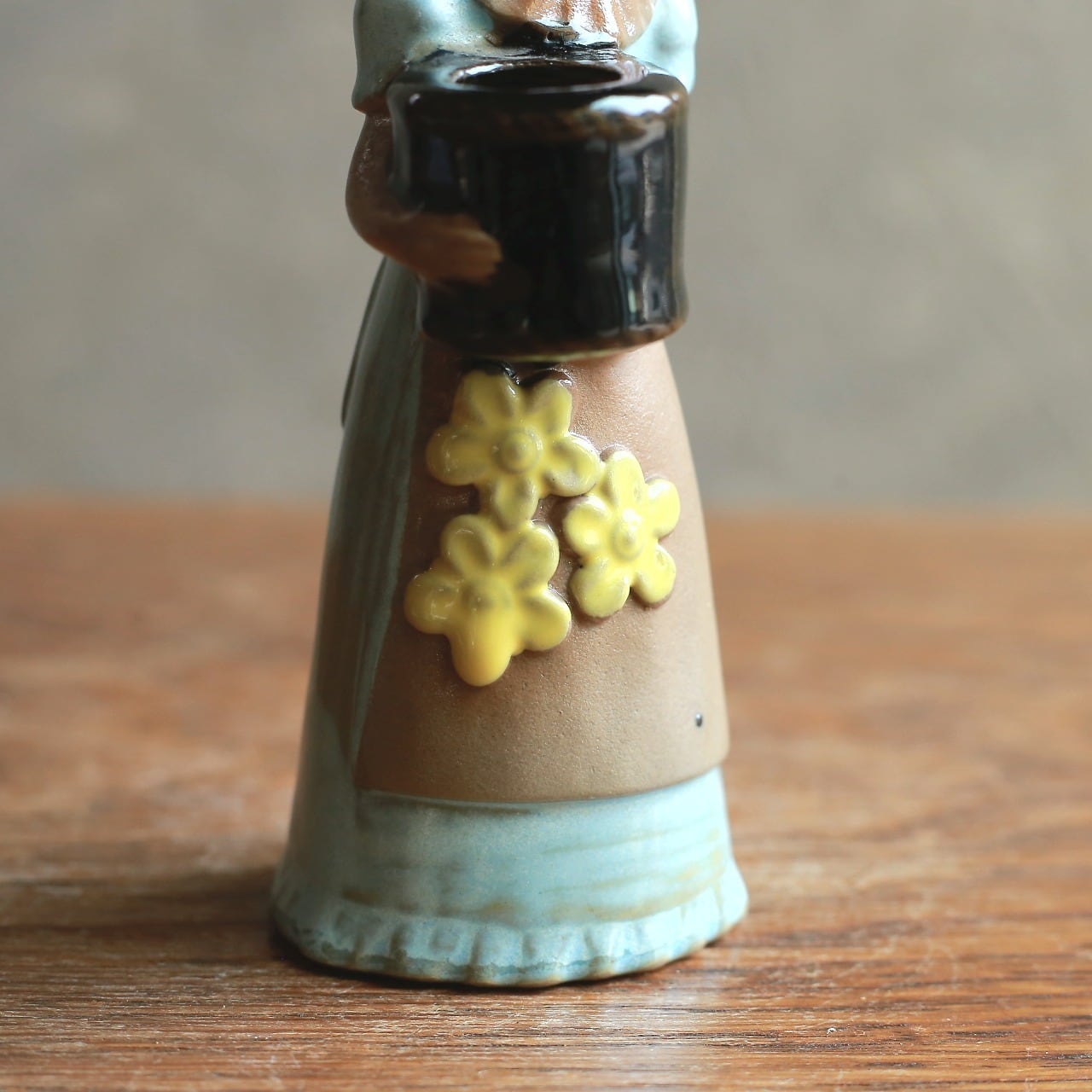 黄色いお花がかわいい、青いドレスのフラワーベース