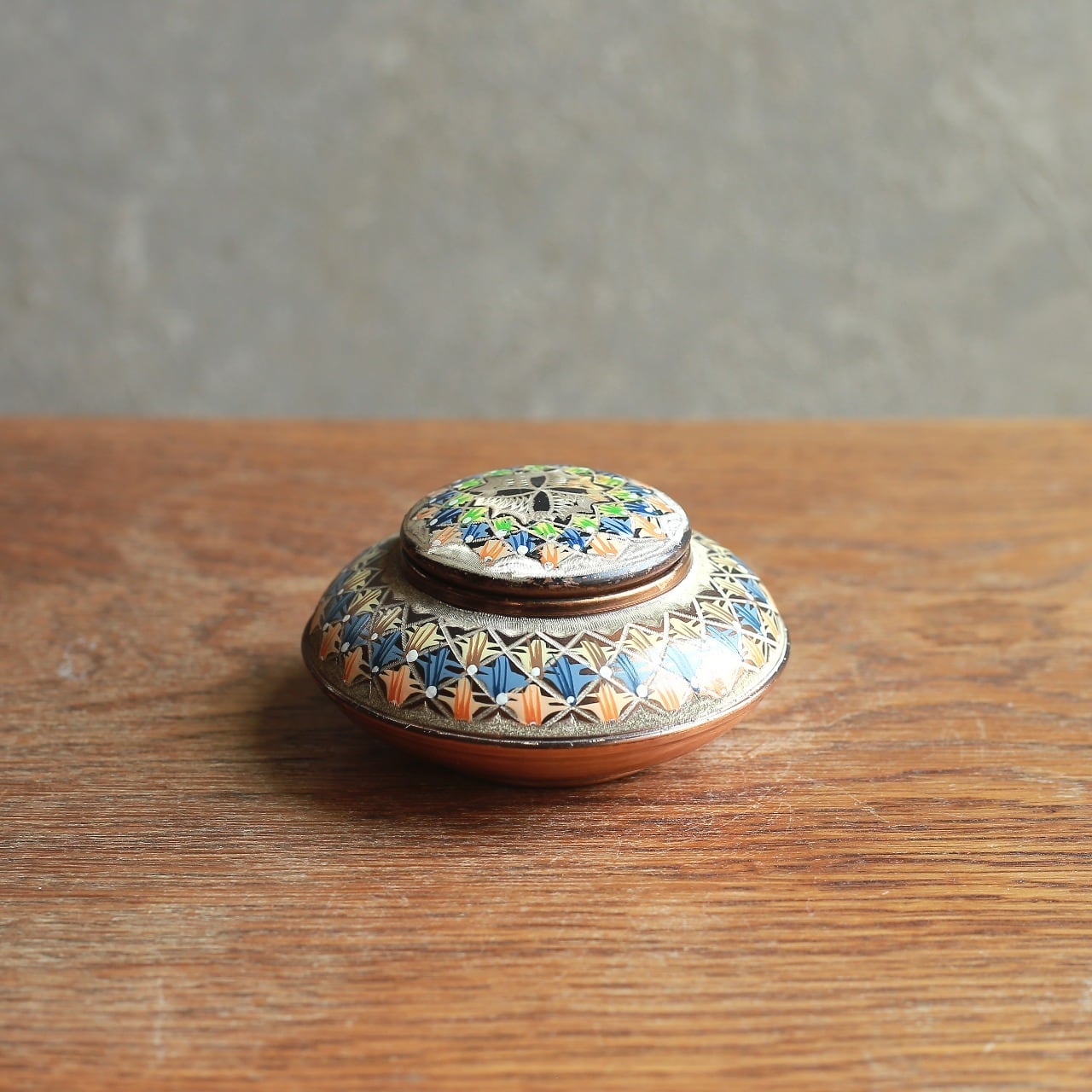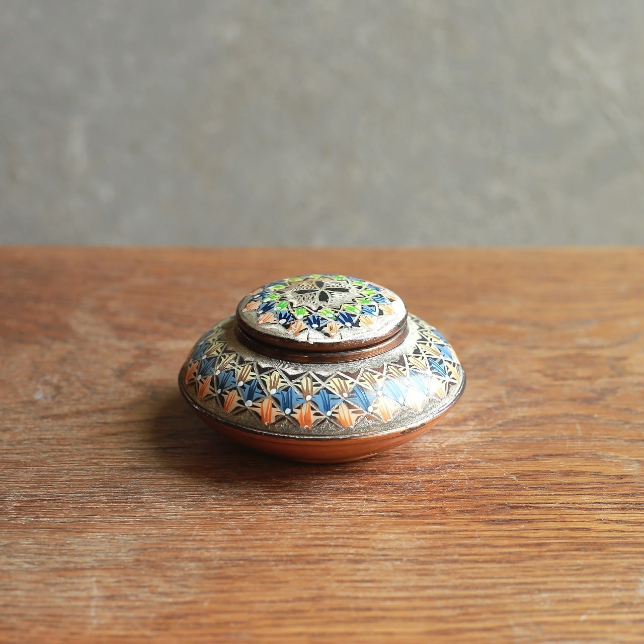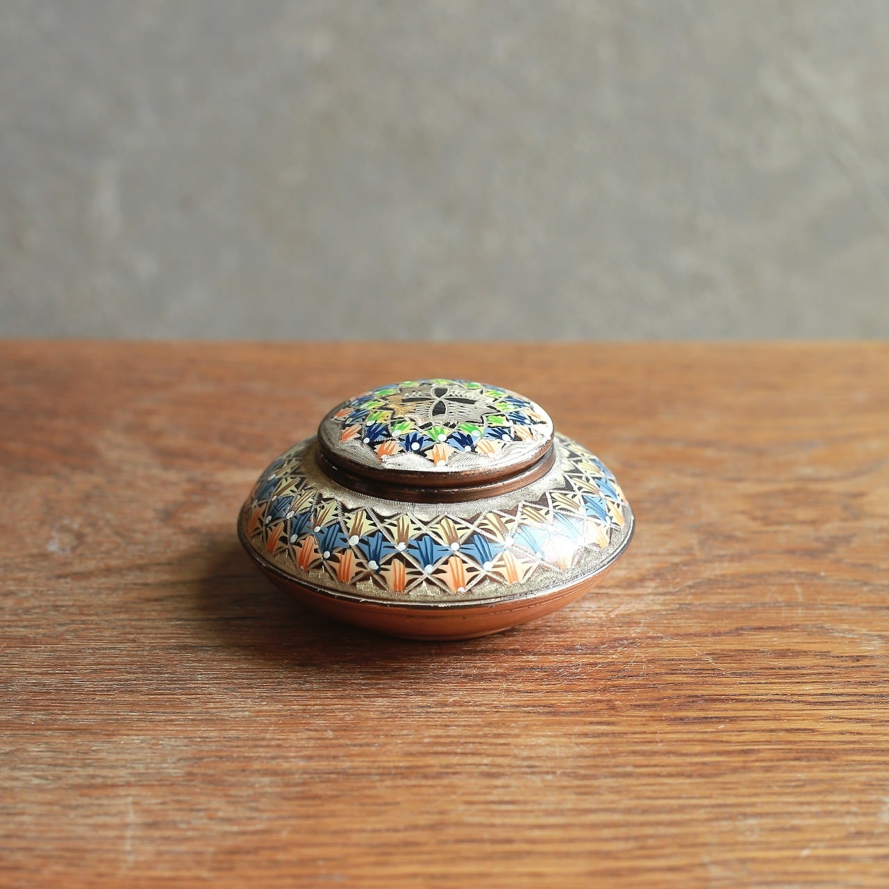幾何学模様が美しい、銅の小物入れ|ヴィンテージ 銅製の小物入れ 蓋物 幾何学模様