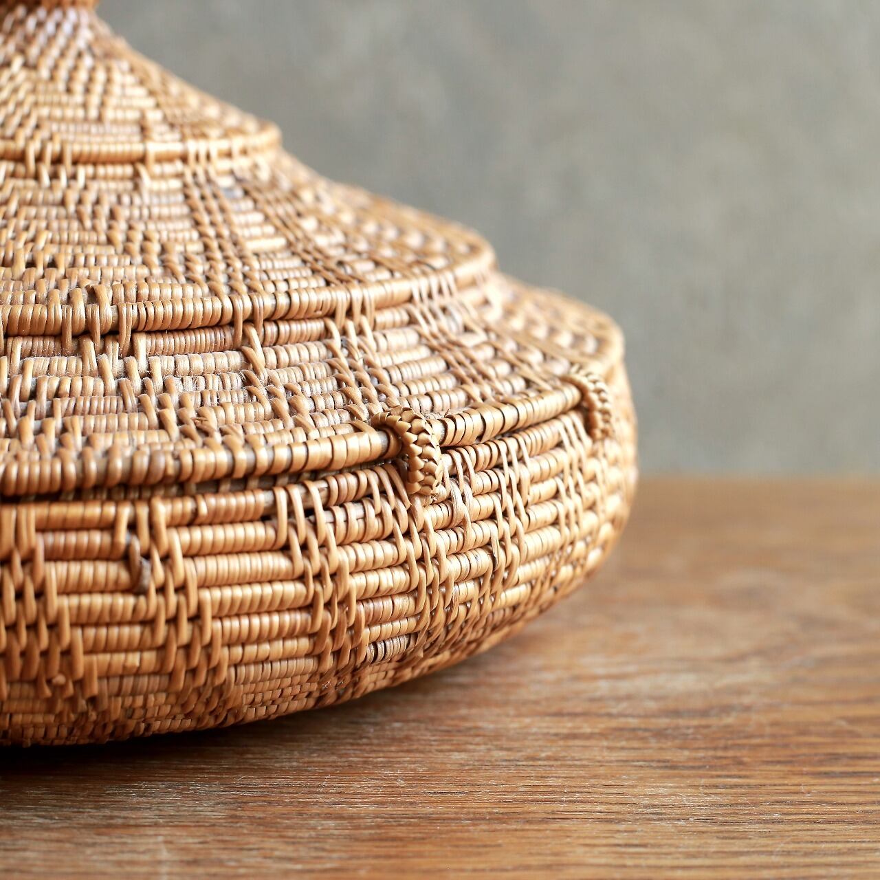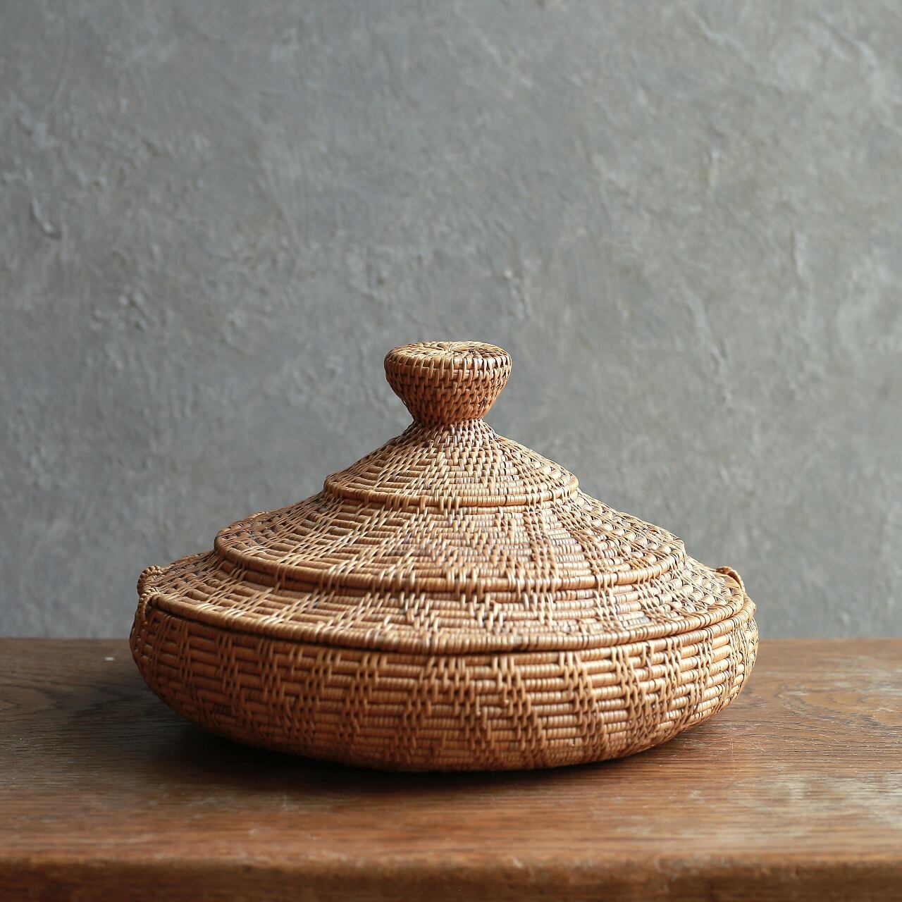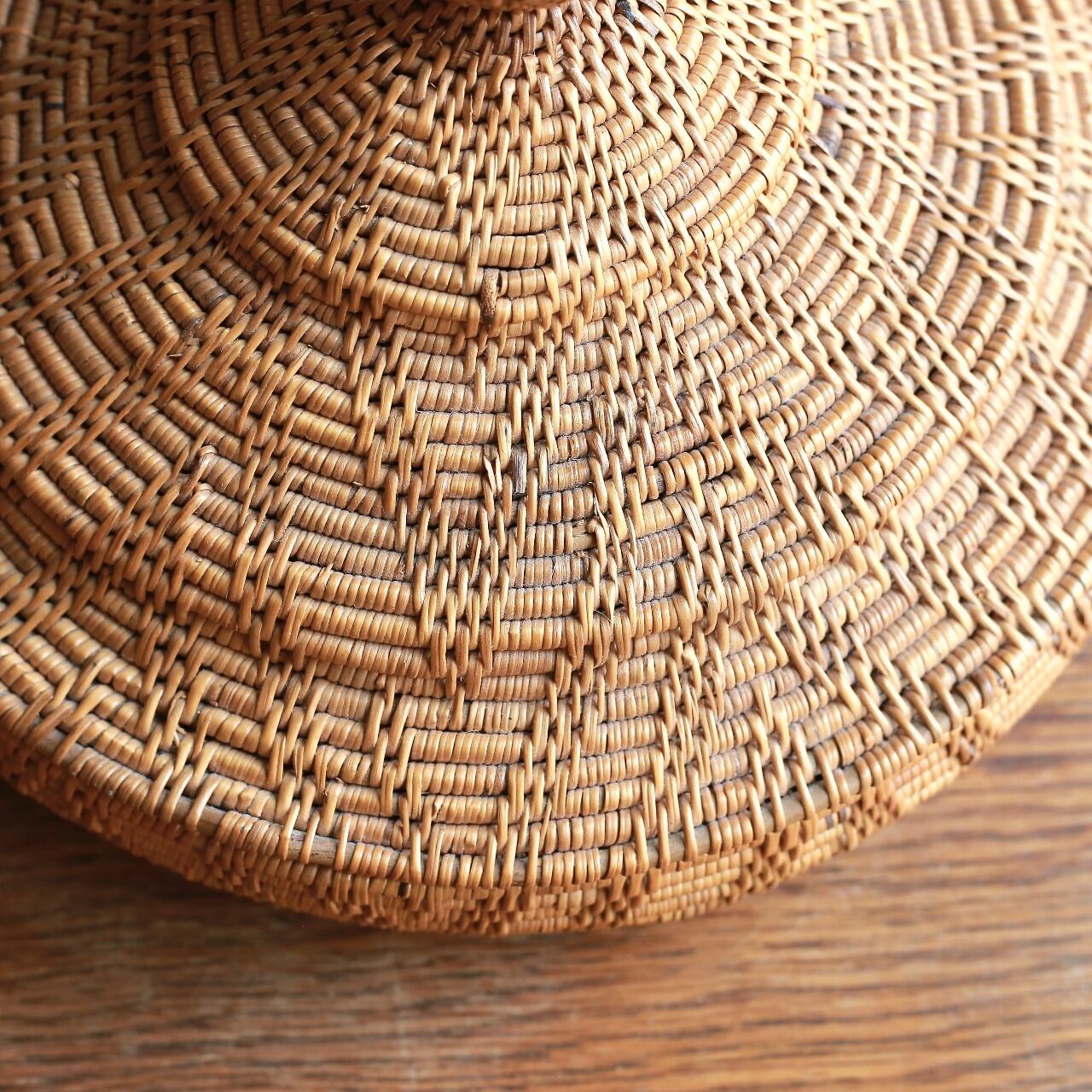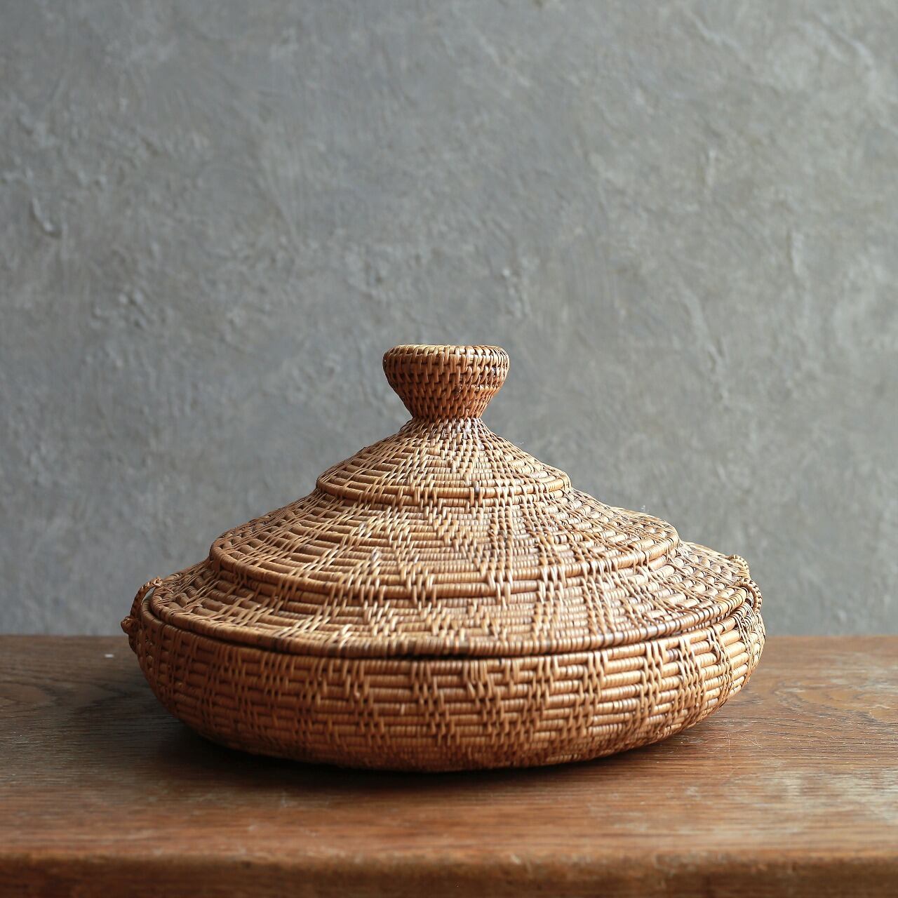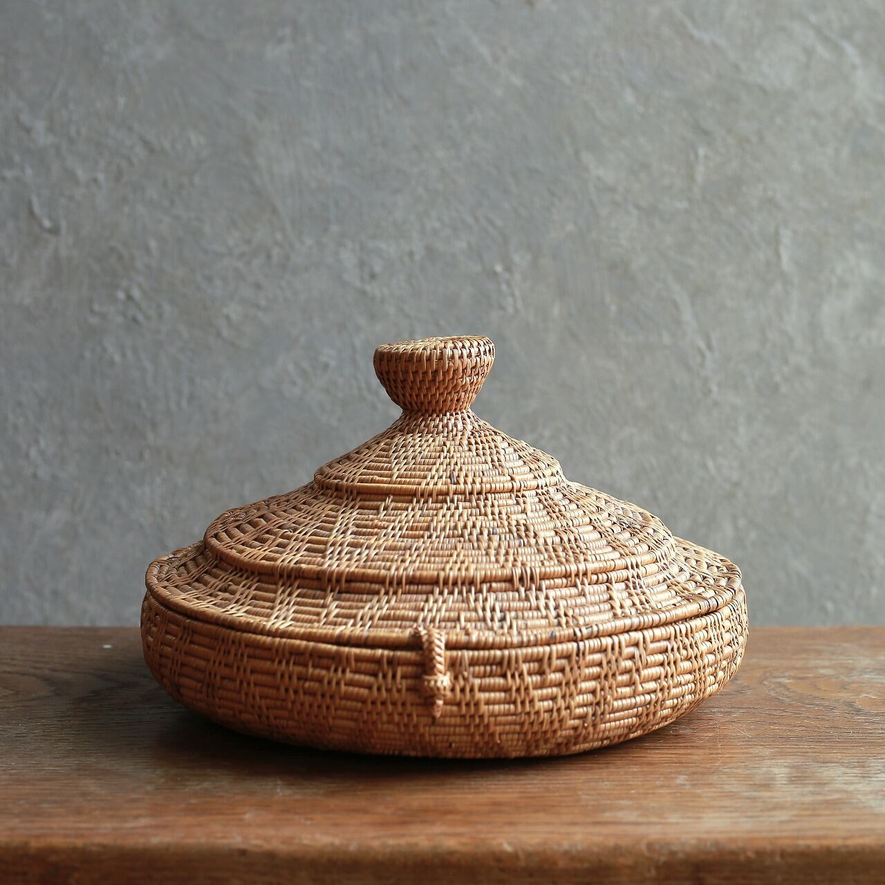 編み模様が美しい、とんがり帽子の小物入れ|アタ 蓋付き小物入れ ラウンドバスケット