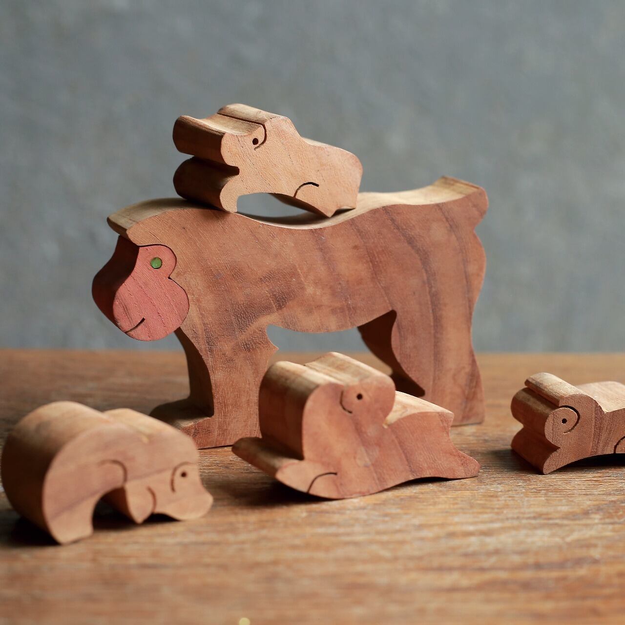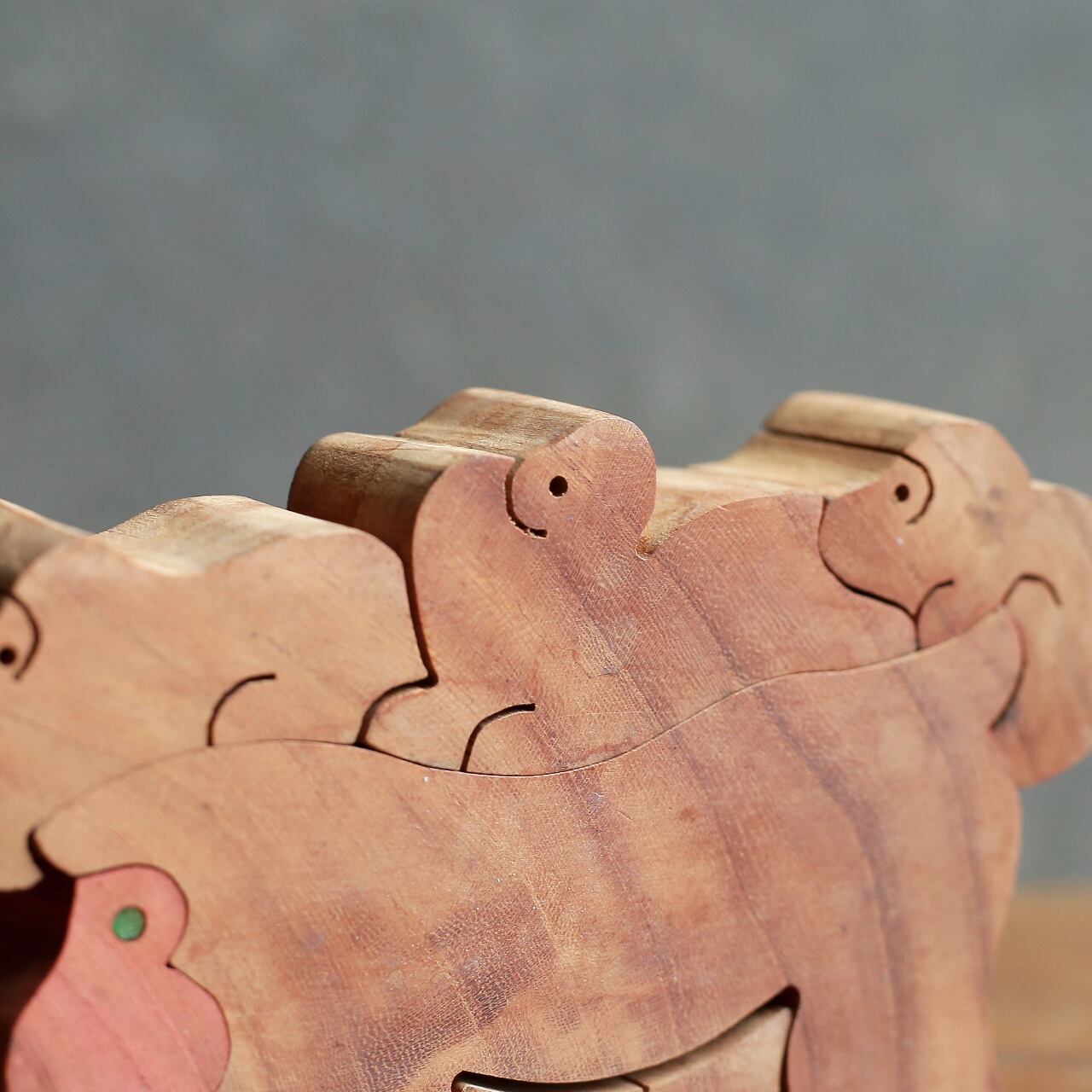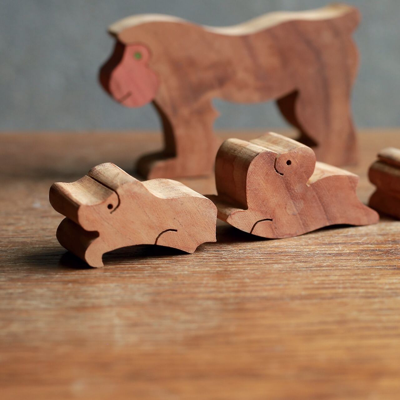 仲良く寄り添う、子だくさんなサルの親子|木製 組み木パズル 猫の親子 置物 オブジェ