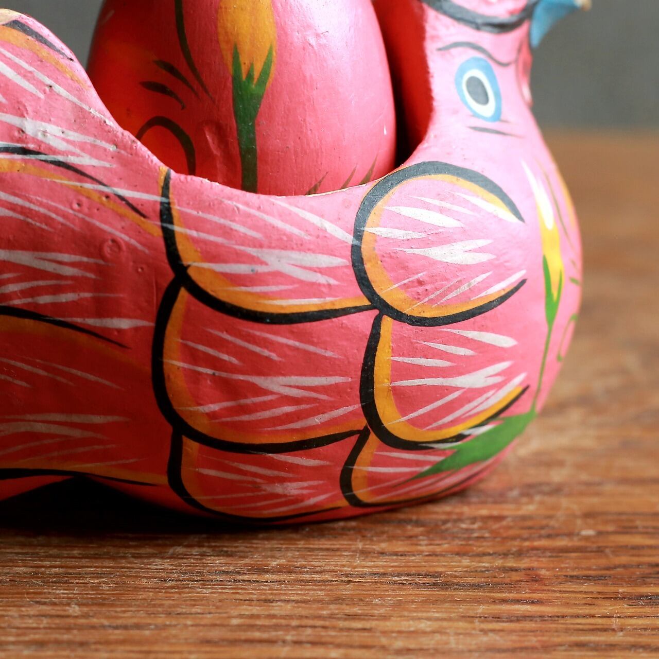 大切に卵を抱える、ピンクのニワトリ