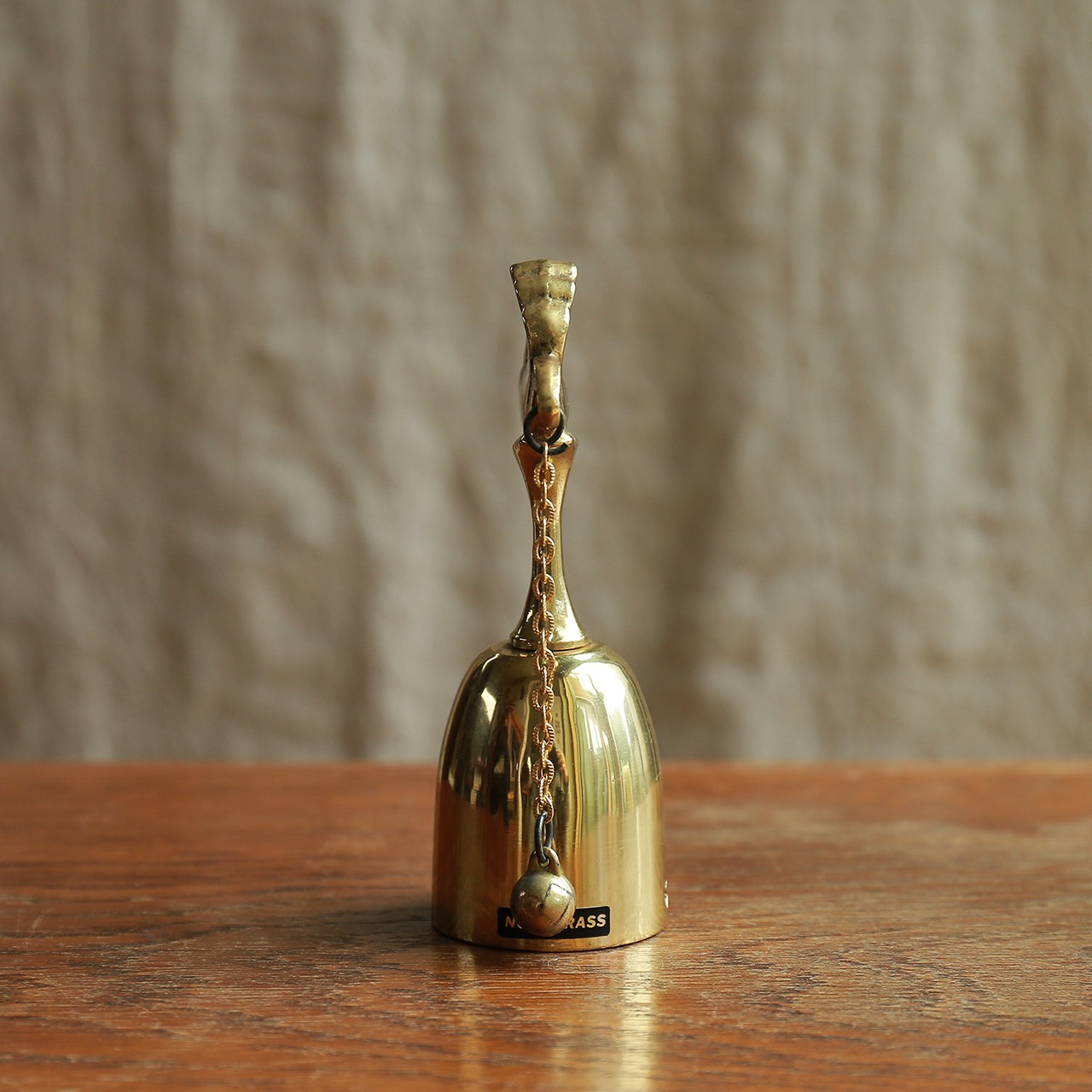 小さな鳥が見守る、真鍮のハンドベル。