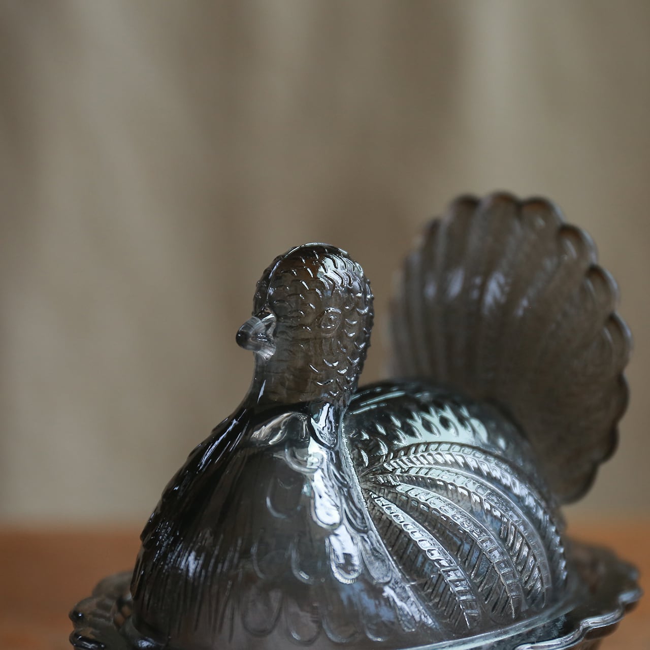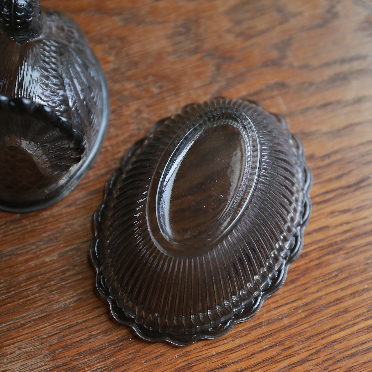 立派に尾を広げた、ガラスの鳥の小物入れ 1