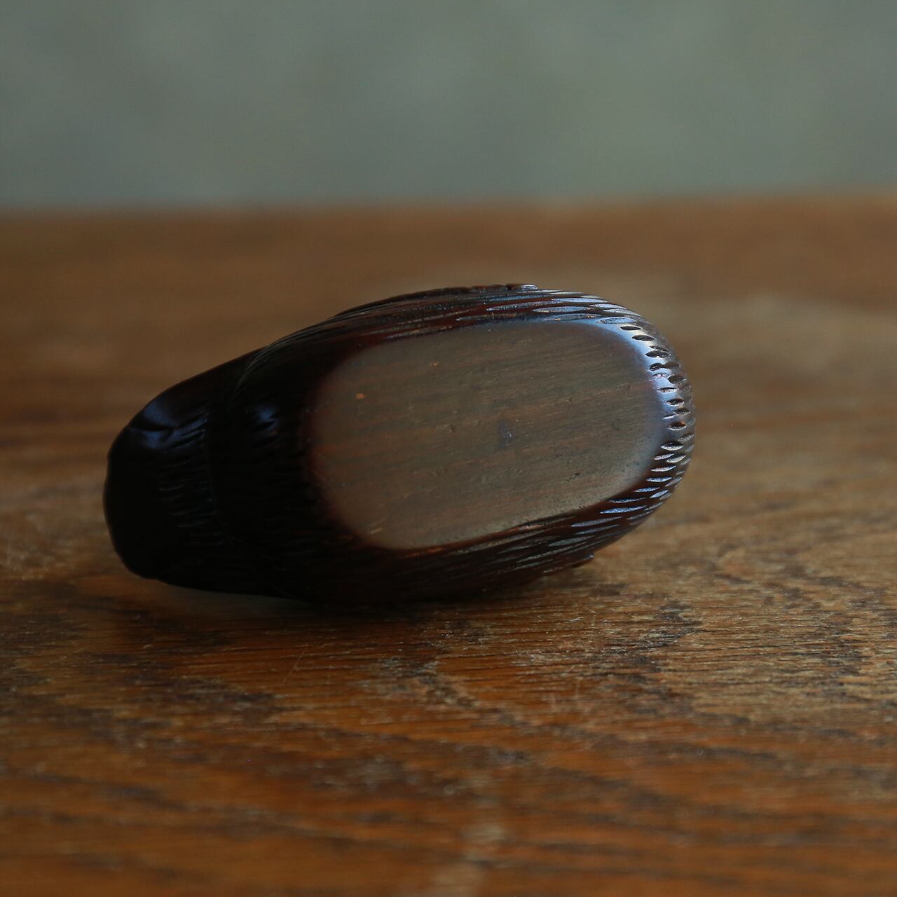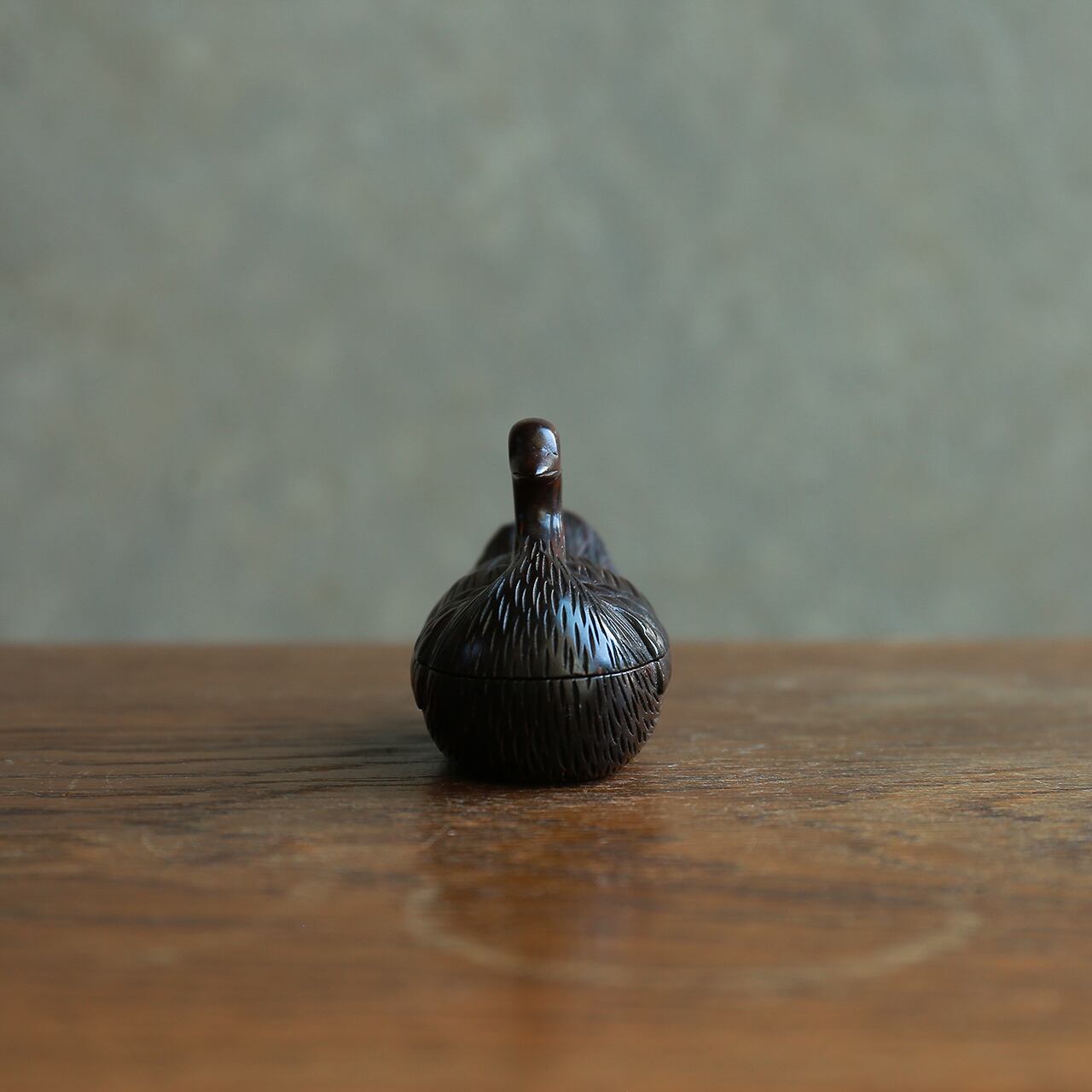 パカッと開く、艷やかな木製の小さな水鳥