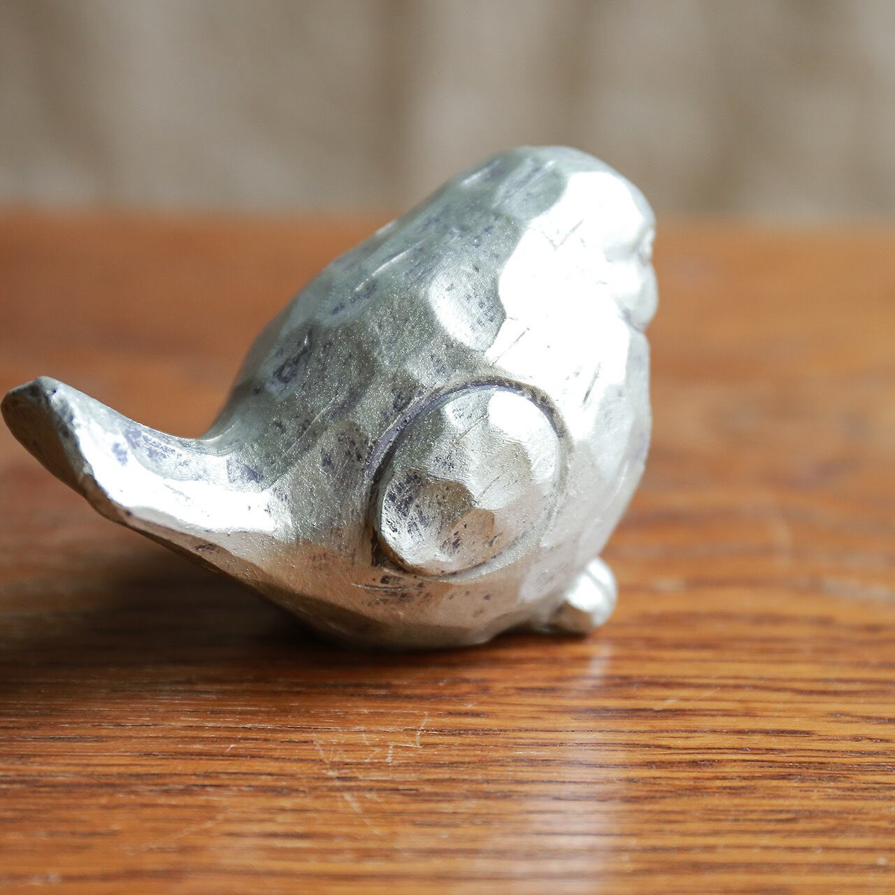 【ご成約品】上品に見つめる、石のフクロウ・コロンとした、木製の鳥(シルバー)